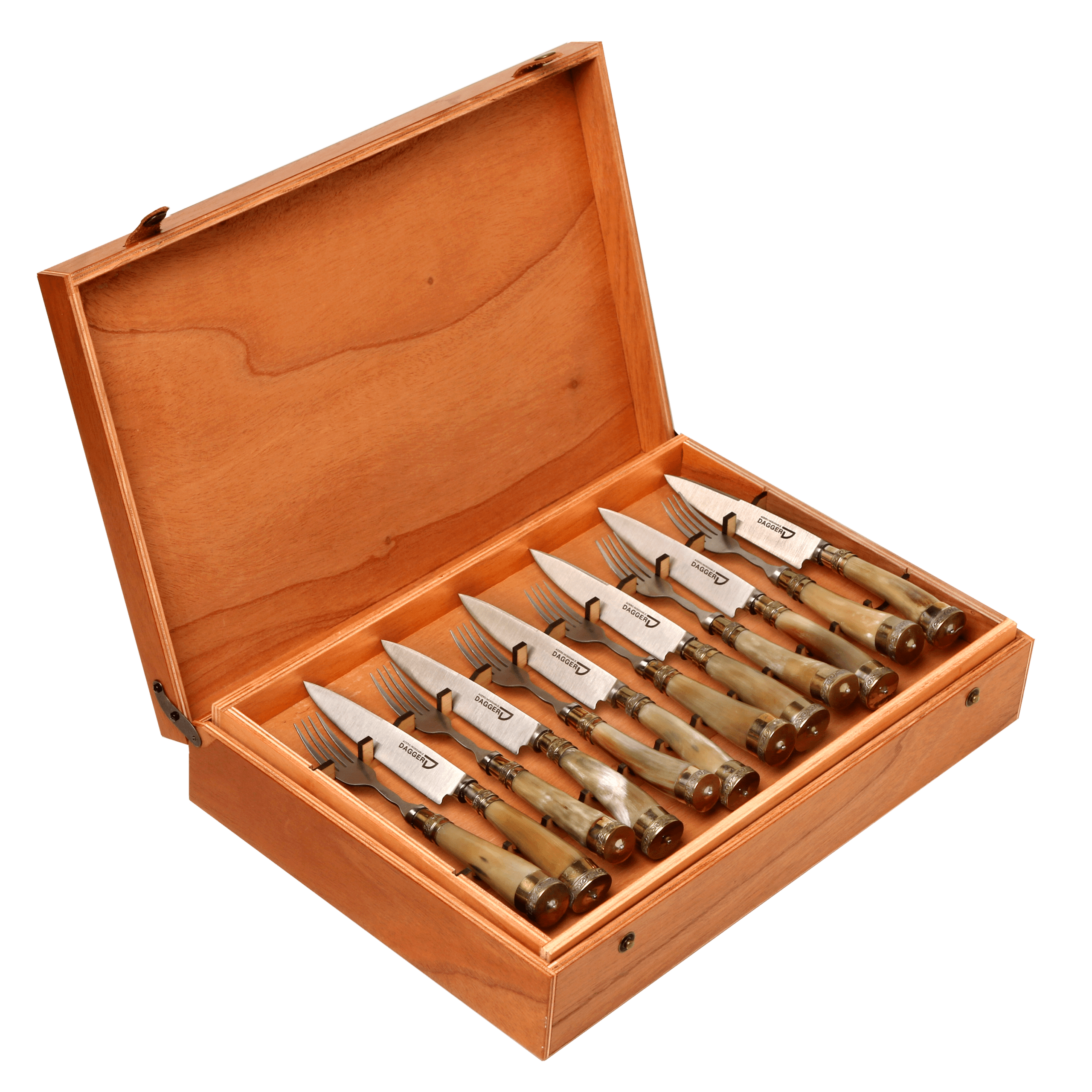 Esta caja está pensada para 12 comensales, por lo que cuenta con 24 cubiertos. La caja está compuesta por: