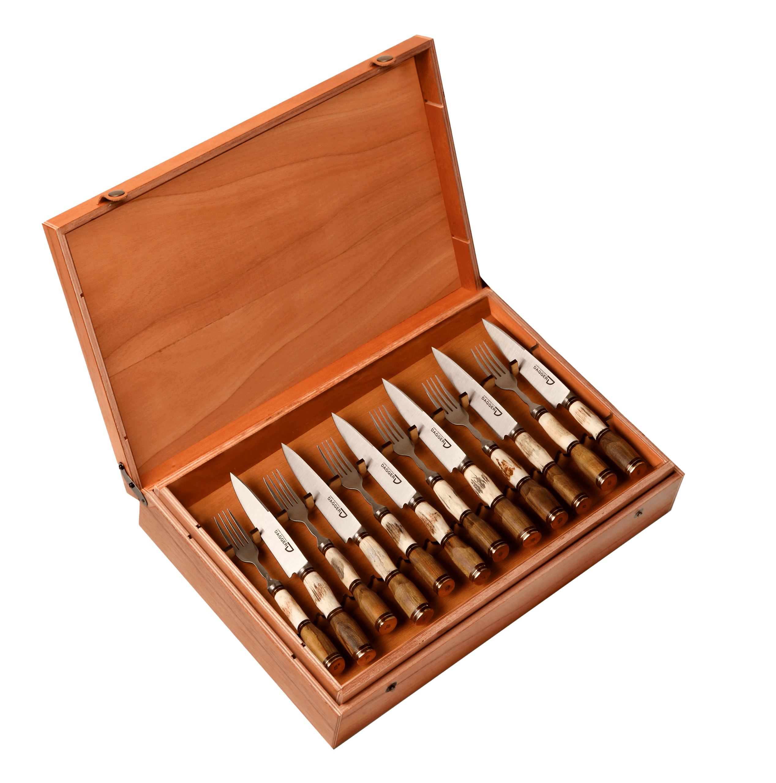 Esta caja está pensada para 12 comensales, por lo que cuenta con 24 cubiertos. La caja está compuesta por: