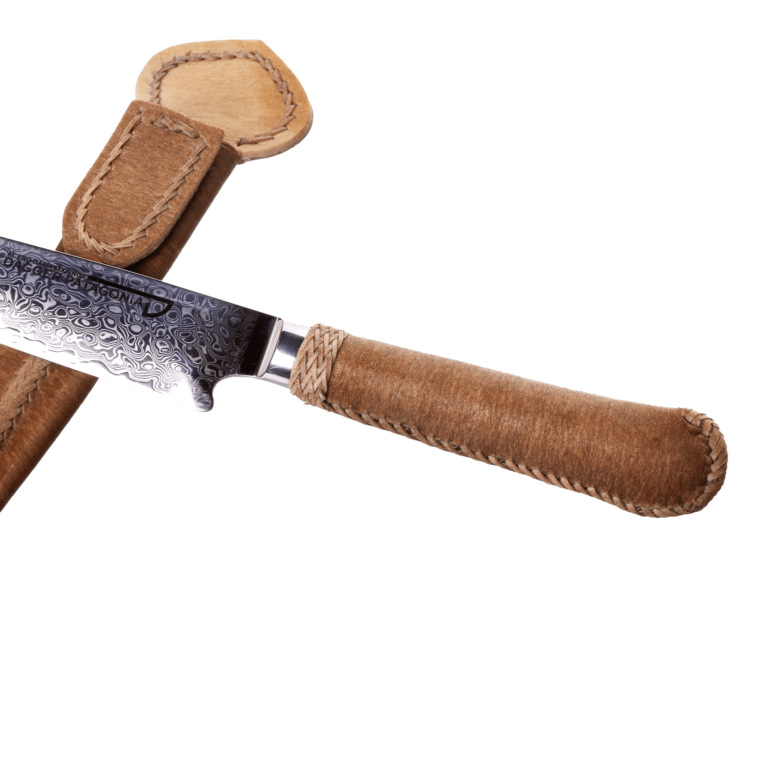 Forjado con una técnica milenaria, el acero damasco tiene una dureza remarcable y un filo “eterno”. Destaca de entre los demás por contar con un patrón único e irrepetible en la hoja.