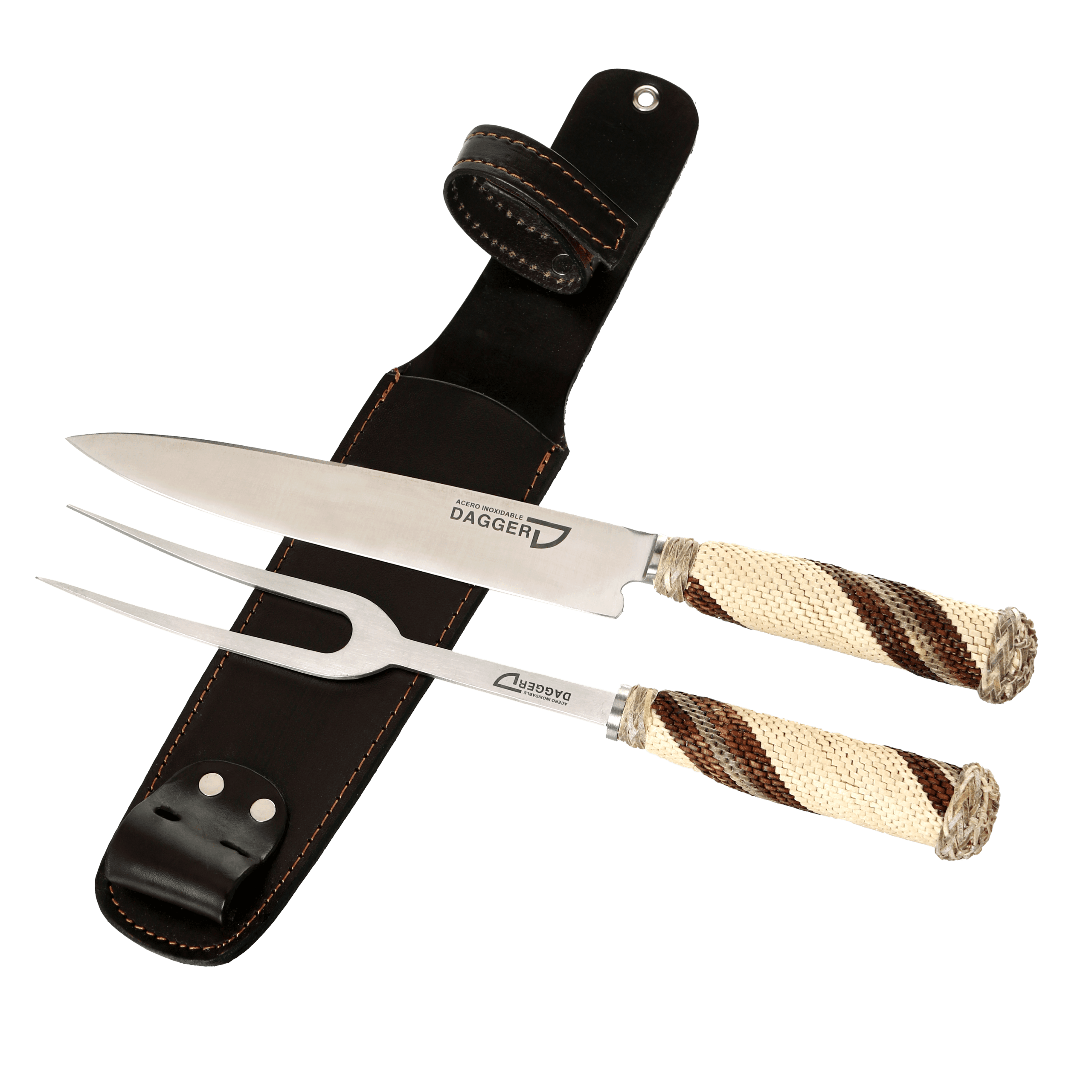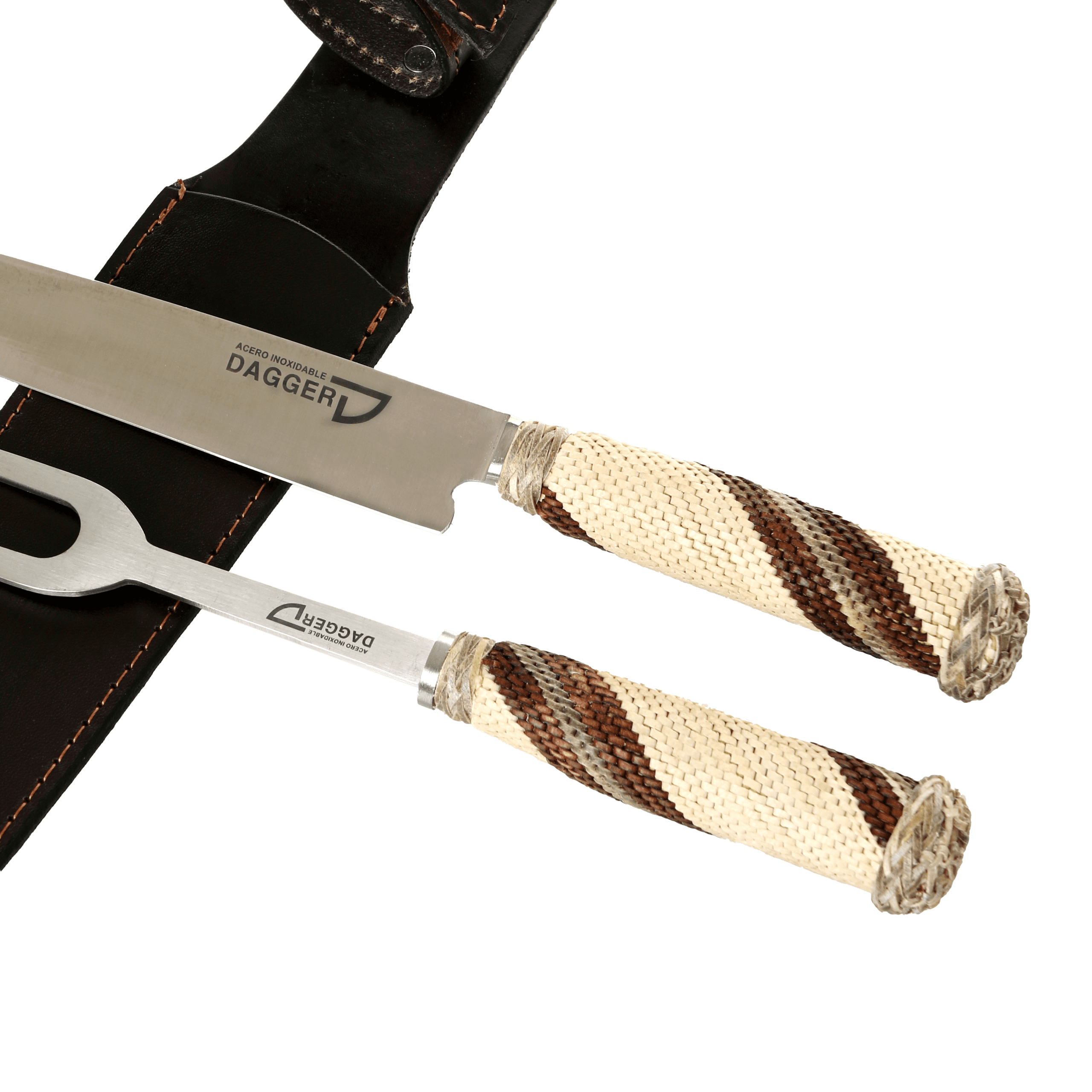 Este juego de cuchillo y trinche está pensado para el momento del corte y preparación del asado ante la parrilla. Su fácil agarre y las hojas que lo componen lo vuelven perfecto para manipular grandes cortes de carne asada.